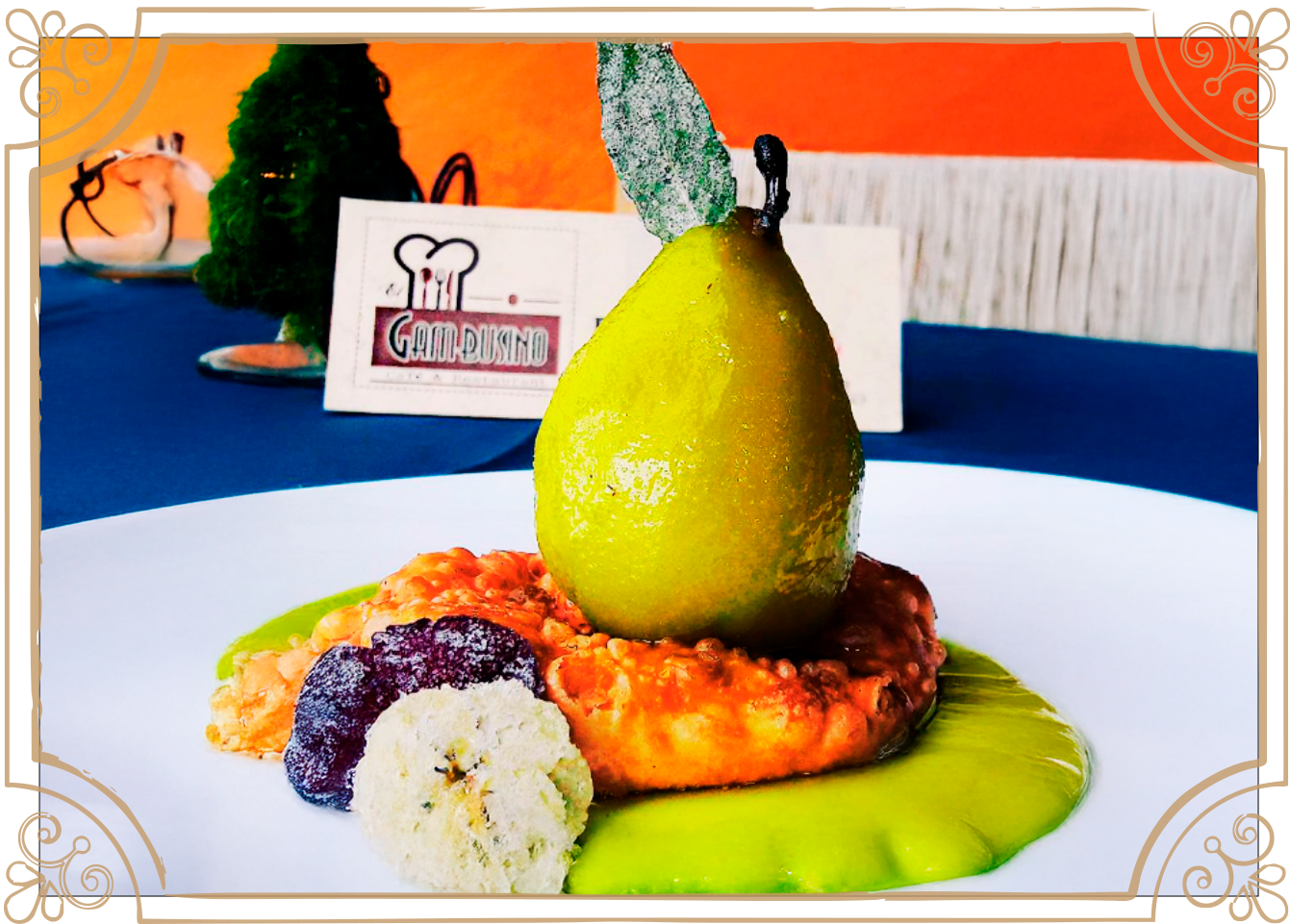 Al ser la oferta gastronómica de El Gambusino los platillos de autor, nace este postre con la intención de presentar una alternativa dulce con base en un producto tradicional del municipio como lo es el licor "La Chiva" y otros productos locales como la pera y flores comestibles de la región.